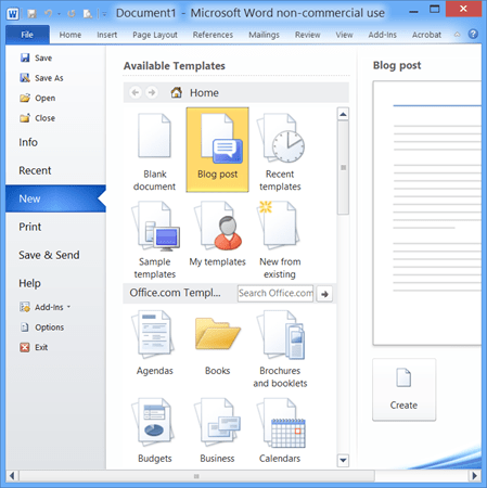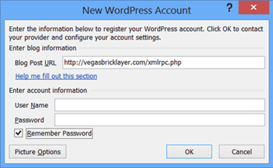 Open Microsoft Word and create a new document based on the Blog post template. If this is your first time creating such a document, Word will ask you to register a blog account. You can do this now or do it later. If you click the Register Now button, Word will launch a blog registration wizard to collect your WordPress URL, user name, and password. The only unusual thing is Word will append xmlrpc.php to your WordPress URL.